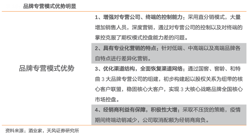 經典案例:根據酒業家、天風證券研究所等綜合資訊表明,2017 年,國窖 1573 提出“基地精耕、內延外擴、中部崛起、東進南圖、區域下沉、市場細分”的戰略方針, 6 月又提出“長三角”發展戰略,將上海、浙北、蘇南作為核心,于華東進行板塊化突破。2020 年,僅在江蘇市場就開設專賣店 200 多家,華東市場連續三年保持全國增速第一。