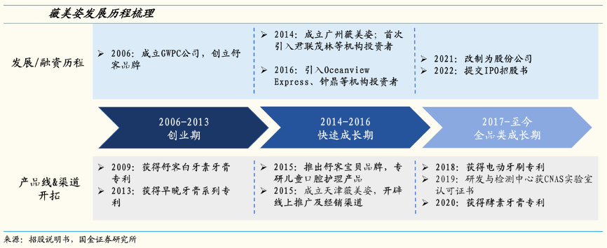 經(jīng)典案例:根據(jù)招股說(shuō)明書、國(guó)金證券研究所等綜合資訊表明,薇美姿于2015年,首次兒童賽道“舒客寶貝”品牌,向細(xì)分人群中高端全品類口腔護(hù)理戰(zhàn)略進(jìn)軍。并于2020年,首次推出酵素牙膏并獲得酵素牙膏專利。