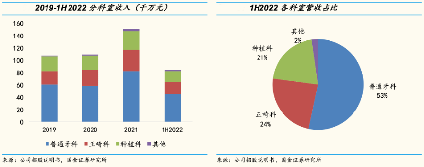 經典案例:根據公司招股說明書、國金證券研究所等綜合資訊表明,瑞爾齒科的業務中普通牙科為主要收入來源,正畸科營收占比不斷提升。1H2022公司普通 牙科收入占比 53.34%,正畸科收入占比 23.73%,種植科收入占比20.69%。