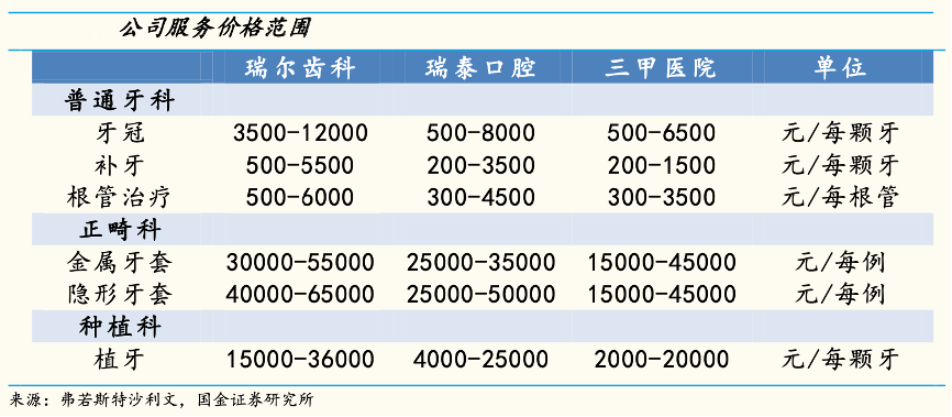 經典案例:根據弗若斯特沙利文、國金證券研究所等綜合資訊表明,與三甲醫院相比,瑞爾齒科公司提供的同類口腔醫療服務的收費一般更高,主要系公司具有更資深的牙醫、更舒適的環境、充足優質的器械和藥物以及更人性化的客戶服務。