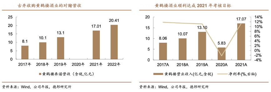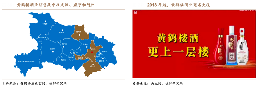 經(jīng)典案例:根據(jù)wind、公司年報和德邦研究所等綜合資訊表明,黃鶴樓在 1984 年/1989 年兩度獲得名酒稱號,古井 2016 年以 8.16 億元收購黃鶴樓 51%股權進入湖北市場,在雙品牌戰(zhàn)略下開啟全國化,并在產(chǎn)品、渠道、品牌、組織架構等方 面進行優(yōu)化:一方面加大黃鶴樓品宣力度;另一方面古井向黃鶴樓派駐管理團隊,嫁接古井優(yōu)秀的渠道運作模式。