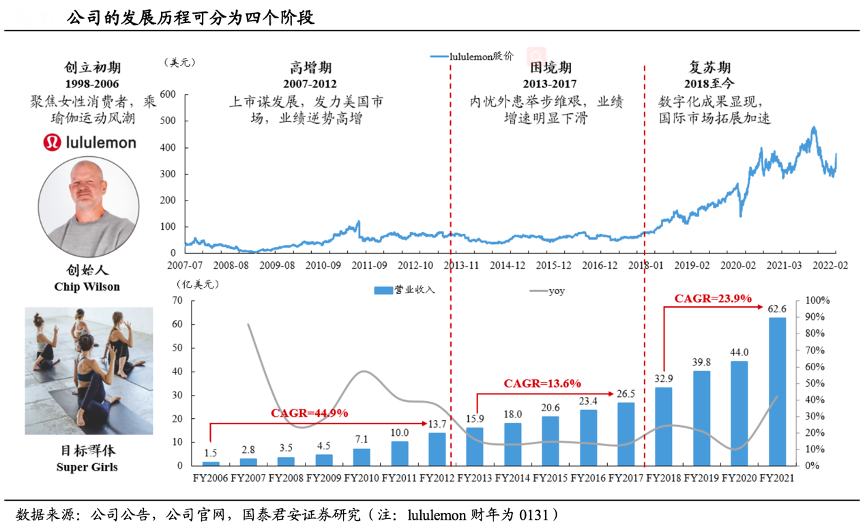 經(jīng)典案例:根據(jù)公司公告、公司官網(wǎng)、國泰君安證券研究等綜合資訊表明,回顧 lululemon 二十余年的發(fā)展歷程,大致可分為創(chuàng)立初期、高增期、困境期及復蘇期等四個階段。