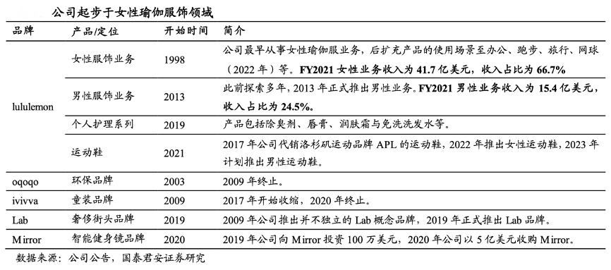 經(jīng)典案例:根據(jù)公司公告、國泰君安證券研究等綜合資訊表明,露露樂蒙于1998 年在北美成立,以售賣女性瑜伽服起家,目前是全球知名的運動休閑品牌商、瑜伽領(lǐng)域龍頭。主品牌 lululemon 的業(yè)務從女性服飾拓展至男性服飾、個人護理及運動鞋領(lǐng)域,產(chǎn)品使用場景囊括瑜伽、跑步、網(wǎng)球、辦公及旅行等。此外,公司還通過自我孵化及收購方式擁有奢侈高街品牌 Lab 及智能健身鏡品牌 Mirror。