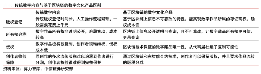 經典案例:根據算力智庫、中信證券研究部等綜合資訊表明,資產確權能力是數字文化產品區別于普通數字內容的重要特點,2021年12月,新華網聯合上海文交所發起構建國家級數字文創規范治理生態矩陣,打造“國家級版權交易保護聯盟鏈”,引導數字文創、數字藝術、數字版權合理有序發展,目前騰訊幻核、百度超級鏈、阿里拍賣、中國互聯網新聞中心等眾多機構已宣布加入“國家級版權交易保護聯盟鏈”,未來數字資產的確權和維權成本將大大降低,數字文化產品價值凸顯。