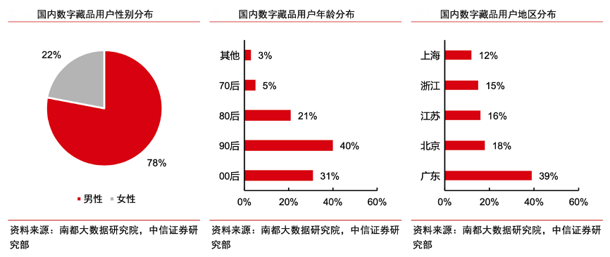 經典案例:根據南都大數據研究院、中信證券研究部等綜合資訊表明,在區塊鏈技術的加持下,非同質化的數字內容和權益得到充分保護,收藏數字內容的邏輯理順。結合南都大數據研究院數據顯示,截至 2022 年 5 月,超過 70%的數字藏品用戶為 90 后和 00 后,表明數字文化產品的內容更加符合年輕一代喜好,未來將成為重要的藝術收藏形式。