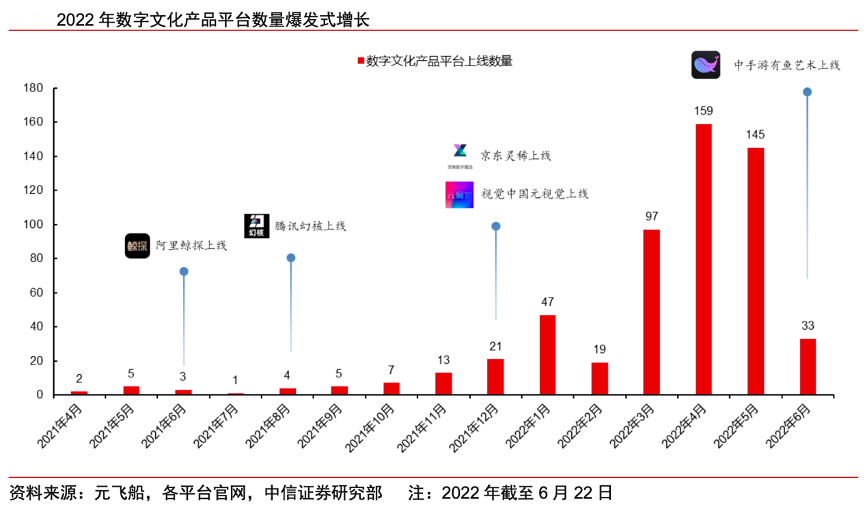 經典案例:根據元飛船、各平臺官網、中信證券研究部等綜合資訊表明,截至 2022 年 6 月 22 日,國內上線的數字文化產品交易平臺已達 681 家,頭部平臺包括阿里鯨探、騰訊幻核、京東靈稀等,主要的參與方包括互聯網公司、文化傳 媒機構和各地文化交易所等。目前市場上以發行平臺為主,用戶購買后不允許出售,并對轉贈制定了嚴格限制。