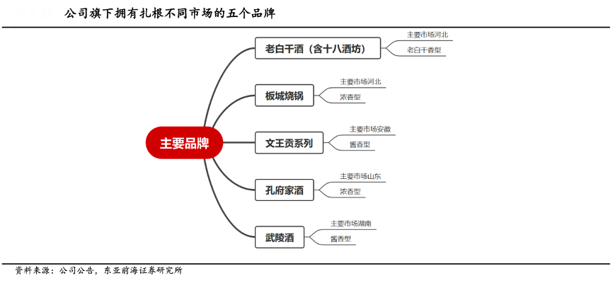 經(jīng)典案例:根據(jù)公司公告、東亞前海證券研究所等綜合資訊表明,老白干酒公司以老白干酒和河北市場起家,通過收購豐聯(lián)酒業(yè)的方式,獲得不同地區(qū)的知名區(qū)域性白酒資產(chǎn),具體包括河北省的板城燒鍋酒(濃香型)、安徽省的文王貢酒(醬香型)、山東省的孔府家酒(濃香型)以及湖南省的武陵酒(醬香型)。收購酒企主營市場均具有較大空間和潛力,而且其現(xiàn)有營銷渠道可以助力老白干推進(jìn)全國化布局。