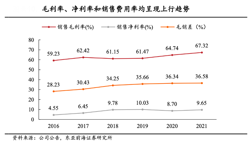 經(jīng)典案例;根據(jù)公司公告、東亞前海證券研究所等綜合資訊表明,橫向比較來看,2021年老白干酒公司的銷售費(fèi)用位居白酒上市公司之首。與此同時(shí),在消費(fèi)者心智培育和渠道建設(shè)的長期投入逐漸轉(zhuǎn)化落地。2016 年~2021 年,公司毛利率由 59.23%增至 67.32%,凈利率由 4.55%增至 9.65%,毛銷差(毛利率減去銷售費(fèi)用率)由28.23%增至36.58%。