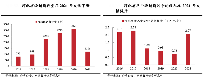經(jīng)典案例:根據(jù)公司公告、東亞前海證券研究所等綜合資訊表明,老白干于2021年進一步優(yōu)化營銷網(wǎng)絡布局,與整體實力較雄厚的經(jīng)銷商合作,加強對于經(jīng)銷商的業(yè)績考核,推進經(jīng)銷商的優(yōu)勝劣汰。從數(shù)據(jù)上來看,2021年經(jīng)銷商數(shù)量同比減少 1885 個,同時單個經(jīng)銷商盈利能力提升,2021年河北單個經(jīng)銷商的收入達到 207 萬元,同比增長183.56%。