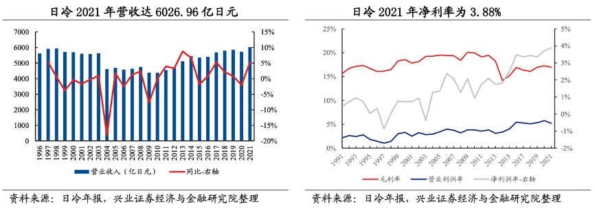 經(jīng)典案例:根據(jù)日冷年報(bào)、興業(yè)證券經(jīng)濟(jì)與金融研究院等綜合資訊表明,日冷集團(tuán)以海產(chǎn)品起家,逐漸發(fā)展成為日本預(yù)制菜龍頭企業(yè)。日冷 2021 年?duì)I業(yè)總 收入達(dá) 6026.96 億日元(約 313.19 億 RMB),過去 10 年 CAGR 為2.85%,2021 年凈利率 3.88%。其擁有日冷食品(調(diào)理食品)、日冷物流(冷鏈物流)、日冷生鮮(海產(chǎn)品和畜禽產(chǎn)品)等主要子公司,形成了全產(chǎn)業(yè)鏈布局。