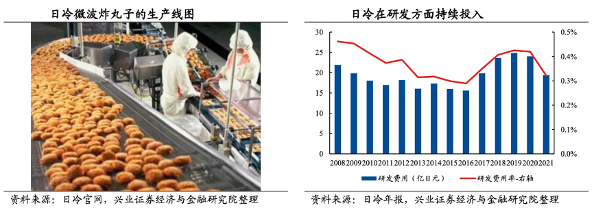經(jīng)典案例:根據(jù)日冷官網(wǎng)、日冷年報(bào)、興業(yè)證券經(jīng)濟(jì)與金融研究院等綜合資訊表明,日冷市調(diào)后發(fā)現(xiàn)消費(fèi)者認(rèn)為鮮炸丸子味道最佳,但油炸過程繁瑣,于是公司抓住該需求痛點(diǎn),技術(shù)方面突破了微波后水分的蒸發(fā)也不影響丸子酥脆口感的壁壘,于 1994 年推出微波炸牛肉丸,廣受市場好評。