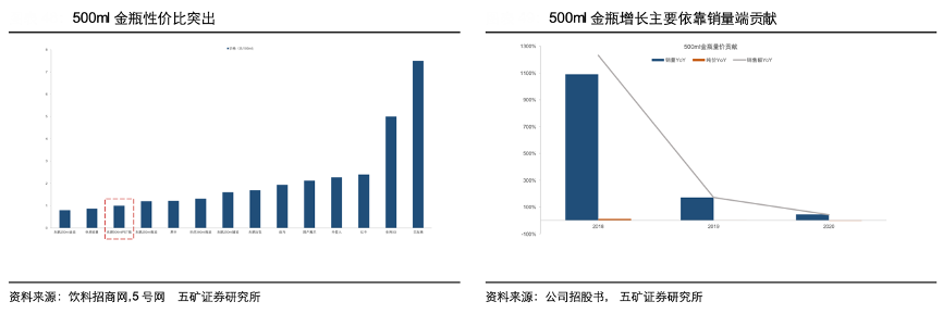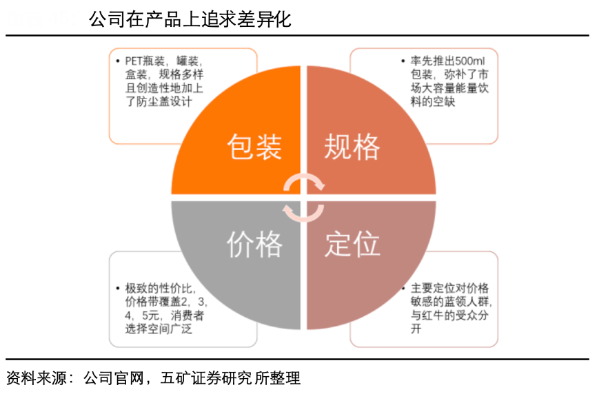 經典案例:根據公司招股書、飲料招商網、5號網、五礦證券研究所等綜合資訊表明,東鵬公司采用差異化戰略,在包裝上避開了價格較高的紅牛三片罐金屬包裝,采用PET塑料包裝,且創造性地配上防塵蓋以適應戶外,長途,旅行等多樣性場景,在此基礎上于 2009 年正式切入能量飲料賽道,推出了系列第一款 產品 250ml 金瓶特飲,定價 3.5 元/瓶,其收獲了大批對價格敏感的藍領人 群如貨車司機,快遞員,外賣員的喜愛。