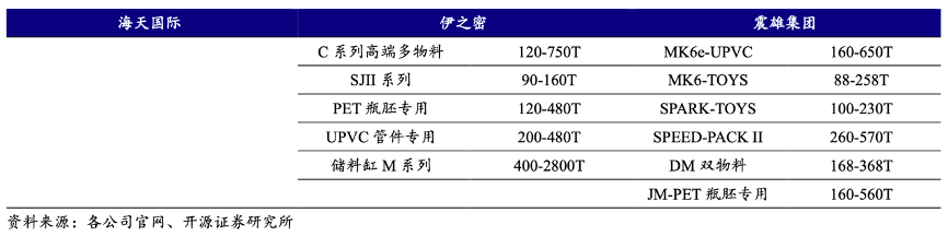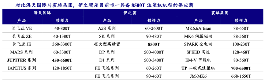 經典案例:根據各公司官網、開源證券研究所等綜合資訊表明,伊之密經過多年的技術積累以及研發投入,在2022 年推出中國首臺 8500T 超大型高精密注塑機,其額定鎖模力為 8500T,最大鎖模力可達 9000T。此產品實現了國產超大型兩板式注塑機關鍵技術的突破,解決了國內超大型透明塑料件難成型的問題,能夠滿足航空航天、汽車工業、石化管道、交通設施等領域對超大型制品的需求。