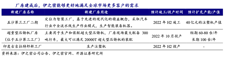 經典案例:根據伊之密公司公告、伊之密官網、開源證券研究所等綜合資訊表明,為應對未來日益擴大的壓鑄機與注塑機的需求,伊之密公司在壓鑄機領域斥資 1.6 億元,建設超重型壓鑄機廠房,在廠 房高度、跨度等規劃上都進行了加碼。在注塑機領域,公司設立五沙第三工廠二期,并在印度建設新工廠,進一步降低出口成本,更好地服務于注塑機業務的海外客戶。
