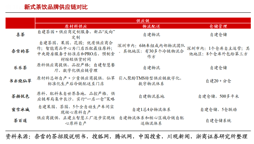 經(jīng)典案例:根據(jù)奈雪的茶招股說(shuō)明書(shū)、搜狐網(wǎng)、騰訊網(wǎng)、中國(guó)搜索、川觀(guān)新聞、浙商證券研究所等綜合資訊表明,新茶飲品牌們正致力于構(gòu)建標(biāo)準(zhǔn)化的供應(yīng)鏈和產(chǎn)品制作體系來(lái)優(yōu)化提升產(chǎn)品品質(zhì)和運(yùn)營(yíng)效率,以奈雪的茶為例,根據(jù)《“數(shù)字化進(jìn)階”—2020新式茶飲白皮書(shū)》及奈雪的茶招股書(shū),公司自建茶園、果園、花園來(lái)實(shí)現(xiàn)食材的一 致性,同時(shí)降低原材料成本;配置中央廚房,從而免去大部分門(mén)店的大面積后廚,降低租金成本同時(shí)實(shí)現(xiàn)了烘焙產(chǎn)品的規(guī)模化生產(chǎn)。