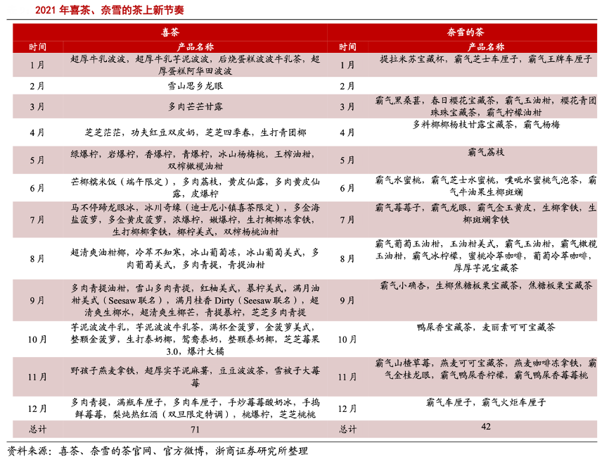 經(jīng)典案例:根據(jù)奈雪的茶官網(wǎng)、喜茶、官方微博、浙商證券研究所等綜合資訊表明,結(jié)合奈雪的茶和喜茶官方微博、微信公眾號(hào)數(shù)據(jù)不完全統(tǒng)計(jì)上新飲品數(shù)量(喜茶 2021 年總計(jì)約 71 款, 奈雪的茶總計(jì)約 42 款),以全年 52 周除以上新數(shù)量估計(jì)得,2021年喜茶平均 0.7 周上新一款飲品,奈雪為 1.2 周。根據(jù)喜茶發(fā)布的《2021 年靈感飲茶報(bào)告》,四款爆檸茶上新當(dāng)天(2021 年 5 月 11 日)賣(mài)出近 40 萬(wàn)杯,成為引領(lǐng)消費(fèi)潮流的出圈爆品,喜茶因此進(jìn)一步加大了品牌知名度,搶占消費(fèi)者心智。