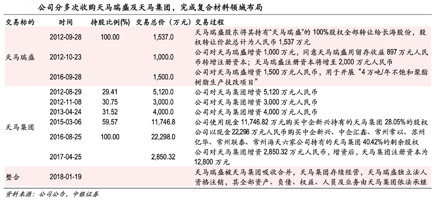 經典案例:根據公司公告、中銀證券等綜合資訊表明,長海股份公司從 2012 年開始 至 2016 年,分多次收購天馬集團及天馬瑞盛,并于 2018 年將兩家子公司進行整合。公司通過天馬集 團開展化工業務,主要產品為不飽和聚酯樹脂,具體產品還包括玻纖粘結劑、羥酯、顏料糊、固化劑、乙烯基酯樹脂等。天馬集團生產的化工制品是公司各類玻纖制品的重要原料,由此,公司已形成“玻纖紗—玻纖制品—樹脂—復合材料”的完整產業鏈布局。