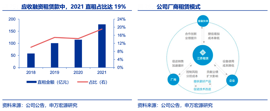 經典案例:根據公司公告、申萬宏源研究等綜合資訊表明,江蘇租賃公司積極與細分市場龍頭廠商建立合作關系,鼓勵、支持開展直租業務,2021年直租合同金額達 179 億元,2018-2021 年 CAGR 達 45.4%,占比提升至19.1%。2021年新增投放中,融物屬性更強的直租占比大幅提升,全年投放占比接近50%。