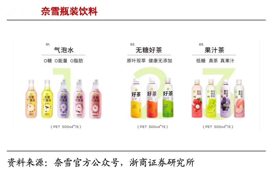 經(jīng)典案例:根據(jù)奈雪官方公眾號、浙商證券研究所等綜合資訊表明,相比傳統(tǒng) RTD 品牌,現(xiàn)制飲料品牌通過線下單個或部分門店試銷產(chǎn)品,“研發(fā)-上新-反饋”周期更短、試錯成本更低,高頻高質(zhì)上新讓現(xiàn)制茶飲線爆品頻出。2022年1月,奈雪推出葡萄烏龍茶和好茶等多款瓶裝飲料,積極入局零售市場,目前RTD產(chǎn)品主要有氣泡水、純茶和果汁茶三類。