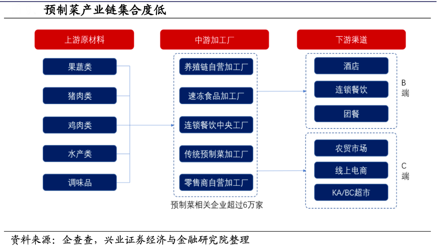 經典案例:根據企查查、興業證券經濟與金融研究院等綜合資訊表明,預制菜產業鏈集合度低。預制菜上游原材料眾多,涉及蔬果、肉制品、水產品等農產品以及調味品,中游加工企業流派眾多,同時下游兼顧 BC 渠道,細分來看,渠道結構多元化程度較高。