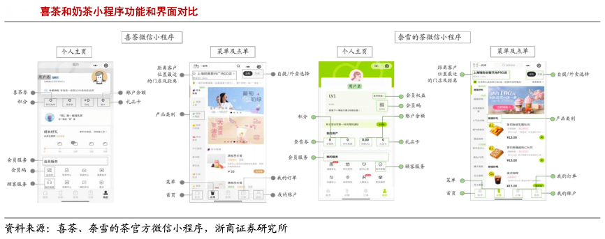 經(jīng)典案例:根據(jù)喜茶、奈雪的茶官方微信小程序、浙商證券研究所等綜合資訊表明,結(jié)合奈雪的茶招股書(shū)及2021 年中報(bào),2019 年 9 月奈雪推出會(huì)員體系,截至 2021 年 6 月 30 日會(huì)員人數(shù)達(dá)到 36.5 百萬(wàn)。截 至 2021 年 6 月 30 日止三個(gè)月內(nèi),活躍會(huì)員總數(shù)約 7.4 百萬(wàn),活躍會(huì)員復(fù)購(gòu)率約為 30.3%。新茶飲企業(yè)正在通過(guò)微信小程序、自有 App 等,提供如預(yù)點(diǎn)單、幾份換禮 品、專屬評(píng)價(jià)渠道等,匯聚消費(fèi)者的訂單信息和意見(jiàn)反饋。