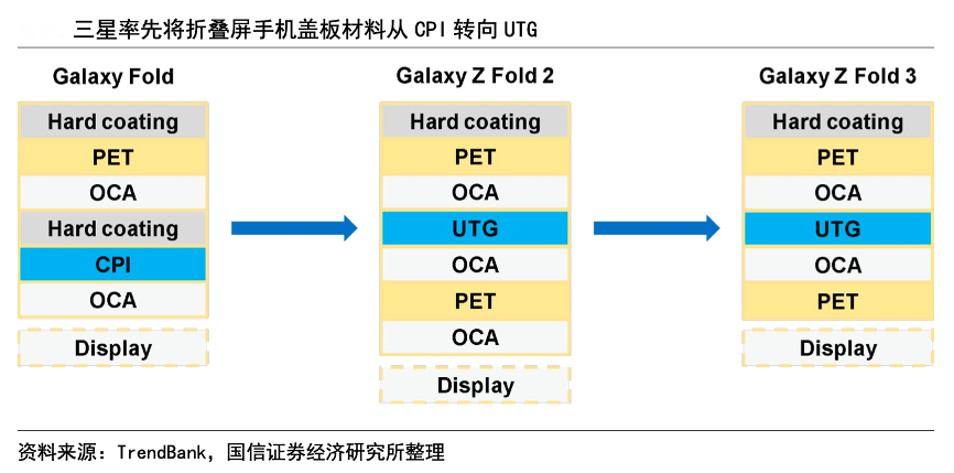 經(jīng)典案例:根據(jù)TrendBank、國信證券經(jīng)濟研究所等綜合資訊表明,三星在2019年推出的 Galaxy Fold 中使用了CPI 蓋板,后續(xù)在2020年推出的Galaxy Z Flip和Galaxy Z Fold 2開始使用UTG蓋板。2021年12月OPPO發(fā) 布旗下首款折疊屏手機 OPPO Find N,2022 年 4 月 vivo 發(fā)布旗下首款折疊屏手機 vivo X Fold,兩者均采用肖特供應的UTG 作為蓋板。