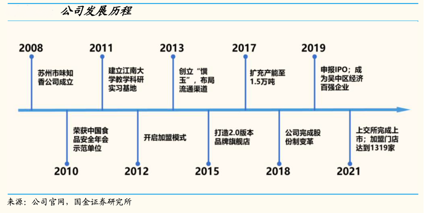 經典案例:根據公司官網、國金證券研究所等綜合資訊表明,味知香公司專注于半成品菜的研發、生產和銷售,目前為華東區域性企業。2012年,公司開放加盟模式 ,此后公司以蘇州為中心,逐步覆蓋業務至長三角區域,在 2021 年 4 月于上交所上市,成為中國預制菜第一股。