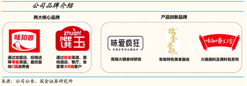 經典案例:根據公司公告、國金證券研究所等綜合資訊表明,味知香兩大核心品牌覆蓋 B/C 端,新設品牌豐富產品線。公司旗下“味知香”品牌面向 C 端消費者,客戶主要為經銷店和加盟店,“饌玉”品牌客戶主要從事冷凍食品批發業務,面向酒店、餐廳、食堂等 B 端。另外公司還開發了“味愛瘋狂”,“搜香尋 味”,“味知香工坊” 等新設品牌系列。