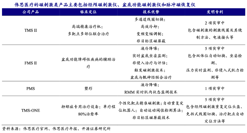 經典案例:根據偉思醫療官網、偉思醫療年報、開源證券研究所等綜合資訊表明,偉思醫療的磁刺激類產品主要包括經顱磁刺激儀、盆底功能磁刺激儀和脈沖磁恢復儀,應用于精神科、心理科、睡眠中心、康復科、神經內科、婦產科、泌尿科、肛腸科、產后康復中心、月子會所等科室及專業機構,用于神經電生理檢查,心境低落、焦慮、失眠等癥狀的輔助治療,以及尿失禁、便秘及腦卒中后遺癥等疾病或癥狀的治療。
