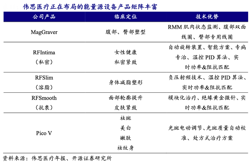 經典案例:根據偉思醫療年報、開源證券研究所等綜合資訊表明,偉思醫療公司瞄準世界級主流產品,全面布局皮秒激光、射頻(私密、溶脂、抗衰)以及塑形磁,利用加速國產替代進口步伐,在國內充分考慮臨床需求和解決方案,通過產品性能、成本、渠道推廣、 學術和服務等綜合優勢幫助公司打開醫療美容行業這一消費驅動的成熟市場。