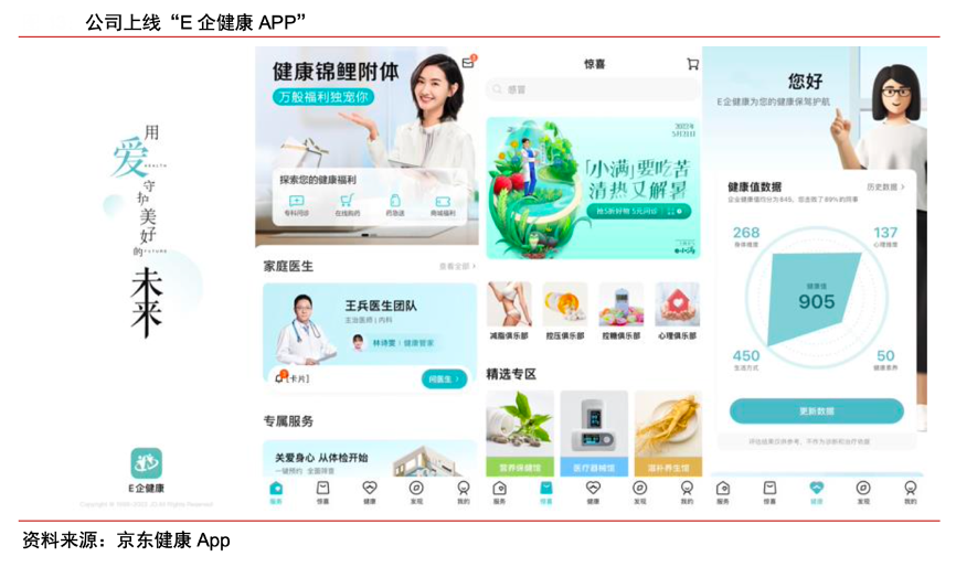 經(jīng)典案例:根據(jù)京東健康A(chǔ)PP、中信證券研究部等綜合資訊表明,京東健康上線(xiàn)企業(yè)數(shù)字化健康管理平臺(tái),通過(guò)B2B2C 模式挖掘用戶(hù)與業(yè)務(wù)新增量。2021 年,公司上線(xiàn)企業(yè)數(shù)字化健康管理平臺(tái)“E 企健康 APP”,為企業(yè)員工提供全面的醫(yī)療健康服務(wù)和豐富的產(chǎn)品選擇。