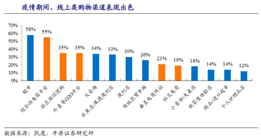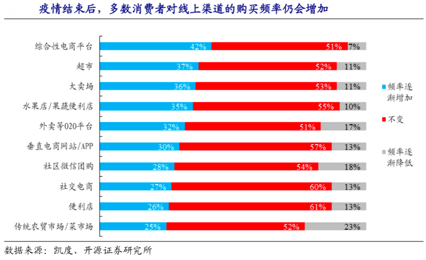 便利性生活消費持續增長,消費者對網絡生鮮消費、便利消費等常規線下生活消費的“線上下單接受度”日益提升。根據凱度、開源證券研究所等綜合資訊表明,疫情結束后,消費者將逐漸恢復在線下渠道的購買頻率,分別有 35% 以上的消費者會更加頻繁地去超市/大賣場,而線上渠道的使用頻率預計仍會強勁增長,42%的消費者會增加綜合性電商平臺使用次數,只有7%的人預計會減少。同時, 外賣等 O2O 平臺以及社區微信團購的使用頻率也將有望持續增長。