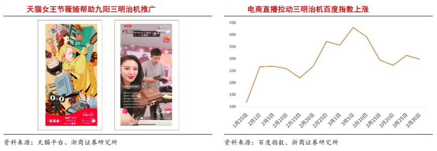 經典案例:根據天貓平臺、百度指數、浙商證券研究所等綜合資訊表明,2020年3 月 3 日-3 月 8 日天貓女王節(jié)活動中,各大三明治機品牌商開始集中跟電商主播合作,其中最具代表性的是頭部主播薇婭幫九陽 LINE 系列的三明治機推廣。據天貓官方公布數據顯示,女王節(jié)三明治機品類銷量首小時同比增長 1500%。