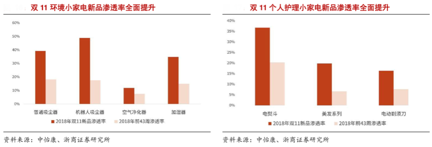 家電的消費場景日益豐富,多種家電品類消費增加,刷新家電品類的消費認知。根據中怡康、浙商證券研究所等綜合資訊表明,環(huán)境小家電品類中傳統吸塵器和機器人吸塵器新品在雙 11 當天滲透率分別高達 39.3%和48.9%,加濕器新品滲透率也提升到 34.9%,三大品類的新品滲透率都翻了一番。個人護理小家電方面,電熨斗、美發(fā)系列、電動剃須刀的新品滲透率分別提升了 16.5%、13.1%和 8.7%,環(huán)比增長顯著。