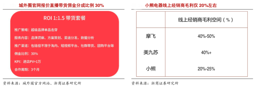 經典案例:根據城外圈官方網站、浙商證券研究商等綜合資訊表明,其官網報價直播帶貨傭金分成比例已經達到30%,而小熊電器的線上經銷商毛利在 20 多個點,而像新寶股份的摩飛,定位時尚歐美風格,毛利空間依然可以保持 40-50%,可以借助直播電商等社交新零售快速擴張。