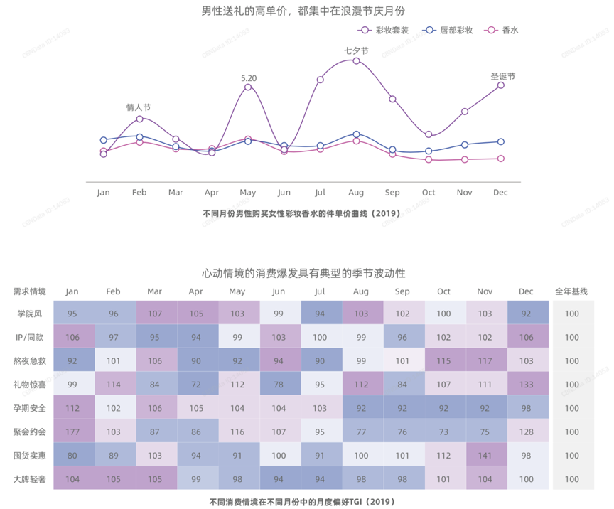 美妝洗護消費屬于“情境式消費”,是“沖動式消費”,優秀的品牌總能點亮原點人群的“心動情境”。根據阿里媽媽、天貓發布alimama insight《后風險時代的中的紅海突圍與藍海發掘》等綜合資訊表明,所謂消費的心動情境是指人們在日常消費中,往往會有一些時點/場景能夠讓人的購買欲得到極大激發。關注不同需求情境的爆發節奏,刷新美妝品牌的“消費訴求”,配合制定年度營銷時間線;學院風集中于開季前后;禮物驚喜爆發于浪漫節點;孕期安全集中于上半年;聚會約會則集中在年末節慶季。