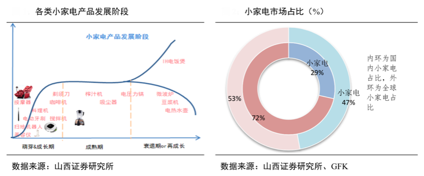 小家電消費持續升級,“品質型消費”成為小家電消費常態。根據山西證券研究所、GFK等綜合資訊表明,各類小家電產品發展已經進入了“消費分級”的時代,以電飯煲為代表的基礎功能性家電消費持續增長,以微波爐、豆漿機等為代表的時尚性家電消費迅猛崛起,同時2018年國內小家電零售額規模占大家電規模 28.5%,遠低于國際平均水平的 50%。在城鎮家庭大家電保有量增速下降明顯的情況下,小家電細分市場的成長擴張仍然具有潛力。