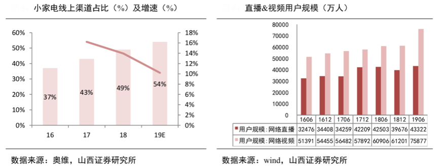 “小家電”從線上渠道興起,“線上線下一體化營銷”成為小家電品牌營銷策劃的主流。根據奧維、wind、山西證券研究所等綜合資訊表明,小家電線上渠道占比持續增長,2019年已經提升至54%,直播、短視頻等新銷售模式明顯發力,網紅潛在受眾群體呈現上升趨勢,跟傳統電商形成優勢互補,線下渠道正快速拓展中,線上線下同向擴張蔚然成風。