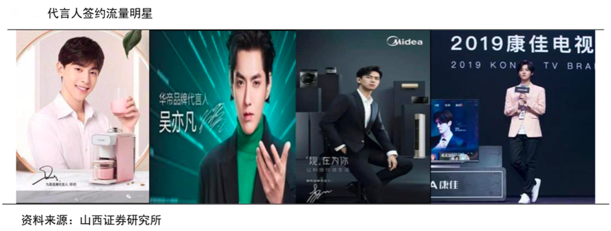 同時,意見領袖引流轉化、“聯合品牌”類產品大行其道。根據山西證券等綜合資訊表明,家電行業在2019年紛紛選擇流量明星代言,其背后驅動因素是粉絲經濟和年輕消費群體的興起。通過明星帶貨拉動銷售、提升活躍、實現品牌年輕化。一些小家電聯名產品發展迅猛,如野獸派 X 美的聯名的茶具系列和美的 X 寶可夢聯名從電磁爐、電燉鍋、電水壺到空氣凈化器,聯名范圍成功從小家電出圈,以“萌趣”引導年輕用戶轉化為品牌粉絲。僅在“雙 11”預購中,淘寶直播間的九陽 LINE 聯名款布朗熊電熱杯銷量達到 2 萬+。