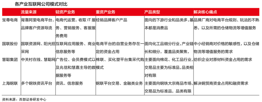 B2B產業互聯網,深度解決產業問題,方有大平臺大未來。縱觀國內產業網經營現狀,根據西部證券研發中心等綜合資訊表明,產業互聯網多數介入到“電商交易”環節,自營業務與平臺業務并存,圍繞產業鏈提供產品銷售交易之外的更多元化的服務,例如:物流倉儲、營銷管理、IT 解決方案等,深度解決產業采購難題,降低企業采購成本,提升產業運營效率。