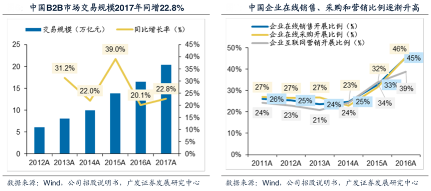 企業電商交易及數字品牌營銷策劃成為產業互聯網企業升級再造推進的“強勁驅動力”,企業側反映出在線開展電商或者營銷業務的需求仍高漲。根據CNNIC披露,2016年底60%的上網企業部署了信息化系統,同比增加13.4%,互聯網應用基礎基本夯實。同時根據wind、公司招股說明書、廣發證券發展研究中心等綜合資訊表明,全國開展在線銷售的企業比例為45.3%,全國開展在線采購的企業比例為45.6%,2016年,企業通過互聯網開展營銷推廣的比例相比去年上升近5%。