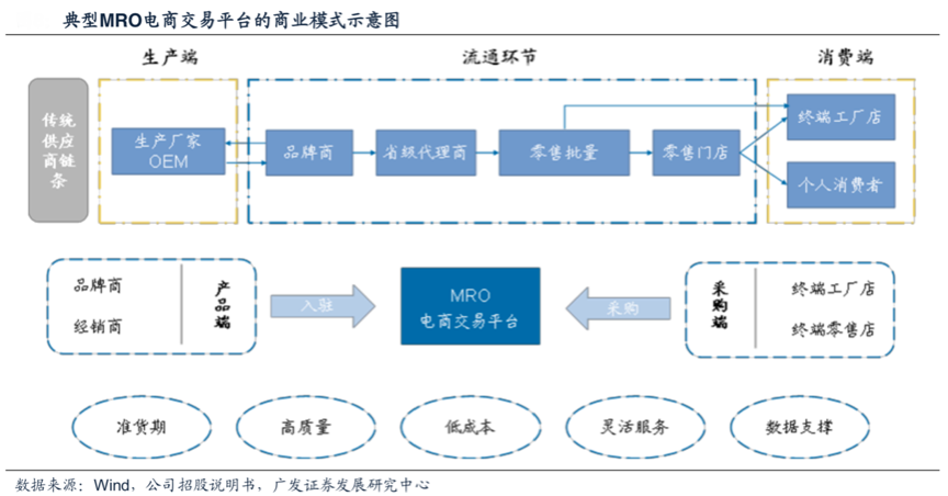 產業互聯網的商業模式有其固定的產業價值,其更多以“產業鏈效率提升”為導向,連接產品端和采購端,提供高質量、準貨期、低成本的產業平臺級服務。根據wind、公司招股說明書、廣發證券發展研究中心等綜合資訊表明,典型的MRO平臺的商業模式重點在于連接產品銷售和產品采購兩大端口,主要對于貨品的責任系保養(Maintenance)、維修(Repair)和運營(Operation),多存在于非生產原料性質的工業用品,這個過程當中平臺方的核心能力體現在需要做到匹配貨 期、高質量、低成本、靈活服務和相應完整的數據支撐。