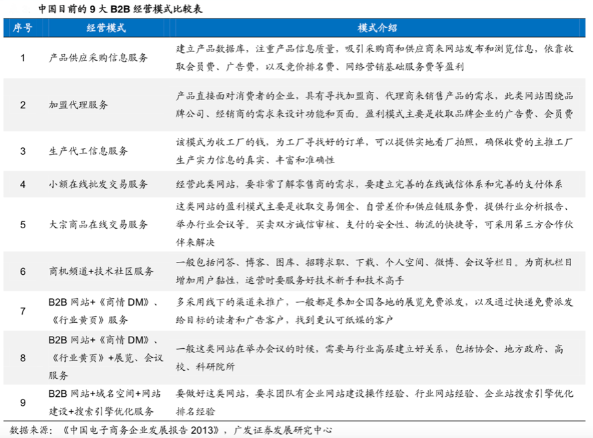商業模式平臺創新的再定義,需要企業更加關注產業鏈服務的多元化,探索產業新零售平臺的模式創新突破。根據《中國電子商務企業發展報告2013》、廣發證券發展研究中心等綜合資訊表明,目前市場上一般的B2B平臺模式主要包含九種: 主要系產業供應采購信息服務、加盟代理服務、生產代工信息服務、小額在線批發 交易服務、大宗商品在線交易服務、商業頻道+技術社區服務、B2B網站+商情DM、行業黃頁服務等,九大模式各有其產業定位及產業價值選擇,產業定位不同、核心價值不同,企業的商業模式創新自然不同。