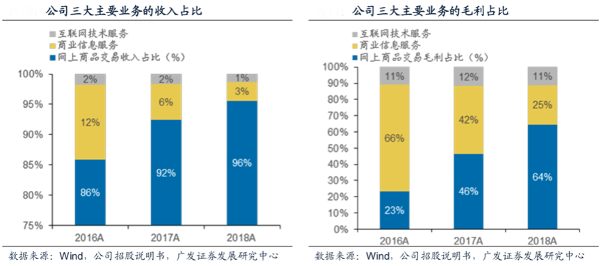 經典案例:國聯股份的業務類型主要是產品供應采購信息服務、各類資訊服務和大宗商品在線交易服務三類,其在收入結構上以電商業務為主,且已經成為業績增長的主要驅動力。根據wind、公司招股說明書、廣發證券發展研究中心等綜合資訊表明,2018年其網上商業交易收入占比主營收入96%,較2016年增加4pct;毛利潤占64%,較2016年增加41pct。商業信息服務收入2018年末僅占3%,較2016年減少9pct;其毛利潤2018年占25%,較2016年減少41pct。