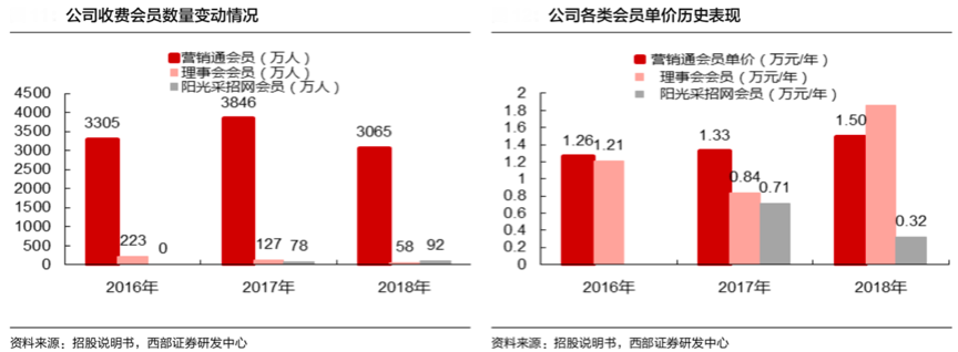 經典案例:根據公司招股說明書、西部證券研發中心等綜合資訊表明,通過國聯網行業網站集群,公司提供的收費會員有營銷通會員、行業理事會會員和陽光采購網會員,通過收取會員費來實現收入和盈利。2018年公司營銷通會員數為 3065 萬,理事會會員和陽光采購網會員為 58 和 92 萬人,總體數量保持平穩。