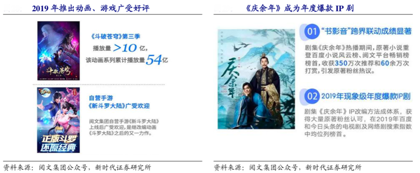 經典案例:根據閱文集團公眾號、新時代證券研究所等綜合資料表明,2019年閱文與多家文娛行業主要發行方和內容制作方完成約 160 部網絡文學作品 IP 授權,首部國內上映電競題材動畫電影《全 職高手之巔峰榮耀》、聯合出品影視劇《黃金瞳》等,《慶余年》作為閱文集團白金作家“貓膩”同名小說改編電視劇更是成為 2019 年最受歡迎的人氣劇集之一。