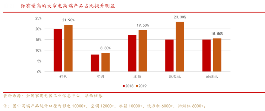 消費升級驅動行業高端化趨勢明顯,品牌形象對品類購買影響力在加大。根據全國家用電器工業信息中心、華西證券等綜合資訊表明,隨著居民收入水平的提高和健康、品質消費觀念的普及,保有量高的大家電高端產品占比提升明顯,家電產品高端化升級趨勢逐漸凸顯,尤其是保有量較高的彩電和冰箱、洗衣機品類。根據全國家用電器工業信息中心線下零售數據,2019 年冰箱 10000 元 以上高端份額從 17.2%上升到了 19.5%,洗衣機 6000 元以上高端品份額由 15.0%快速 上升至 23.3%;空調 12000 元以上的高端份額占比也從 8.0%提升到了 8.8%。