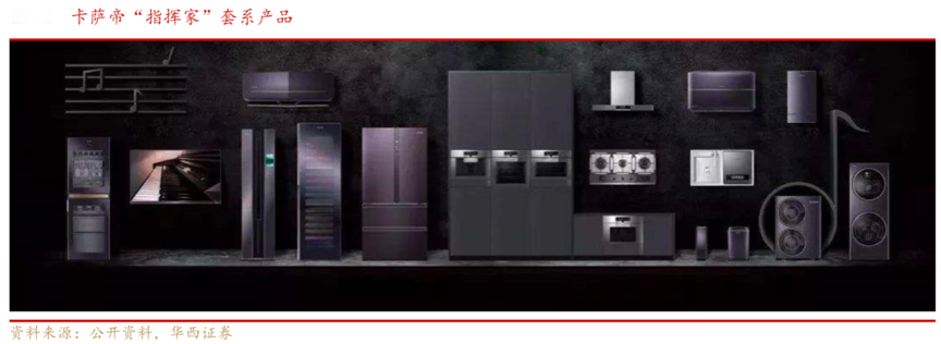 經典案例:根據公開資料、華西證券等綜合資訊表明,2019年海爾發布卡薩帝“指揮家”套系高端智慧成套產品,內含冰箱、酒柜、洗衣機、空調、廚電等 21 款新品,冰箱、洗衣機合計占比預計達到 80%,同時卡薩帝大力推動廚電等品類發展,目前品牌旗下廚電包括煙灶消、洗碗機、蒸烤箱等 10 個細分品類,熱水器涵蓋 5 個細分品類,分別均有近百個型號。