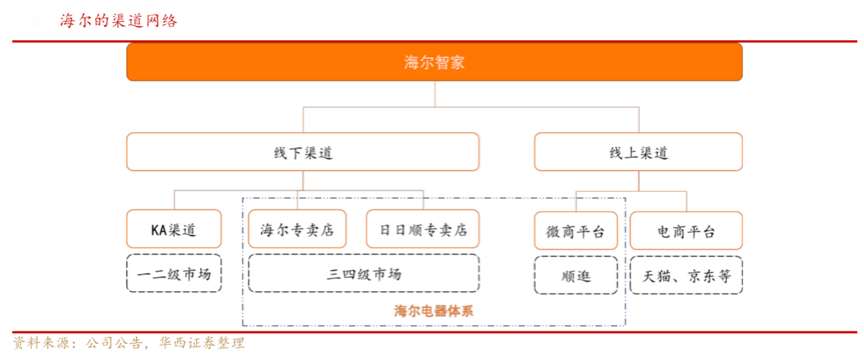 經典案例:根據公司公告、華西證券等綜合資訊表明,海爾公司已經構筑了“全渠道”的競爭護城河,線下渠道主要分為 KA 渠道和自有專賣店渠道,線上渠道則主要有第三方電商平臺和自有社群交互平臺。公司主要負責一二線 KA 銷售渠道,控股子公司海爾電器則主要通過海爾和日日順專賣店渠道覆蓋三四級市場,2015 年日日順推出微商平臺順逛,加盟店可以在順逛上快速注冊自己的微店,并上架相應的產品,或者分銷日日順提供的貨源,既輕庫存運營又能實現豐富 SKU 銷售場景,實現雙線融合。截至 2019 年上半年,公司全國共有 8000 多家縣級專賣店、30000 余家鄉鎮網絡,海爾電 器日日順物流共管理倉庫總面積 500 萬平方米,其中自建倉庫比例達24%,運營車輛 15 萬 輛,已建成 96 個城市轉運中心,覆蓋各省會城市及重要地級市。
