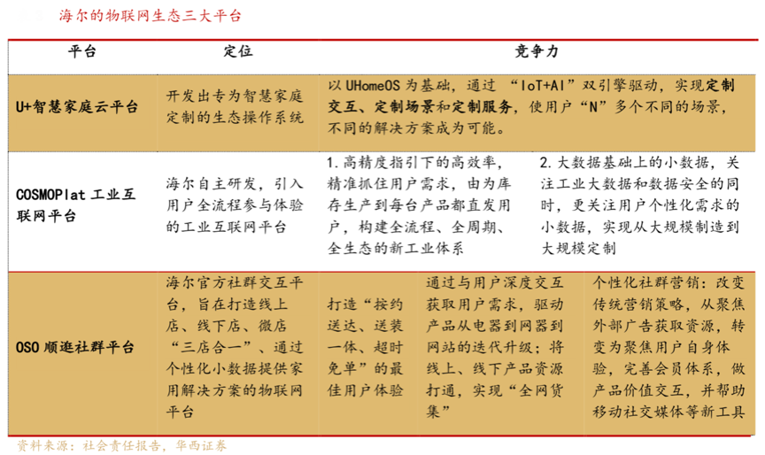 經典案例:根據社會責任報告、華西證券等綜合資訊表明,海爾已形成 U+智慧家庭云平臺、COSMOPlat 工業互聯 網平臺和 OSO 順逛社群平臺三大系統的物聯生態體系,其中順逛作為“用戶傳感器”, COSMOPlat 讓產品、服務及解決方案快速落地,U+云平臺聚集更多的開發者,三者合力搭建物聯網生態平臺,引領行業風尚。